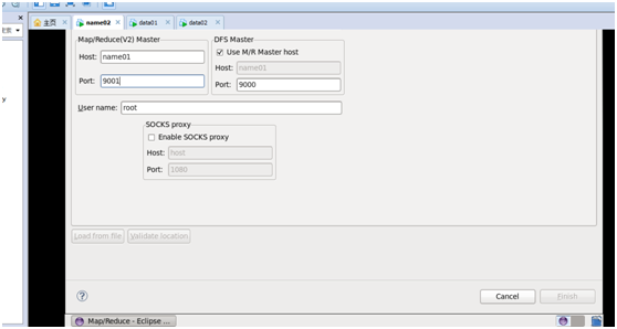 输入 Location Name,任意名称即可. 配置 Map/Reduce Master 和 DFS Mastrer,Host 和 Port 配置成与 core-site.xml 的设置一致即可。