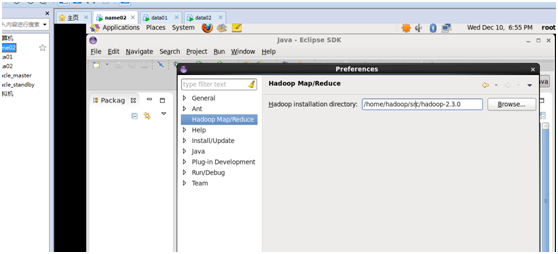 如果插件安装成功,打开 Windows—Preferences 后,在窗口左侧会有 Hadoop Map/Reduce 选项,点击此选项,在窗口右侧设置 Hadoop 安装路径。