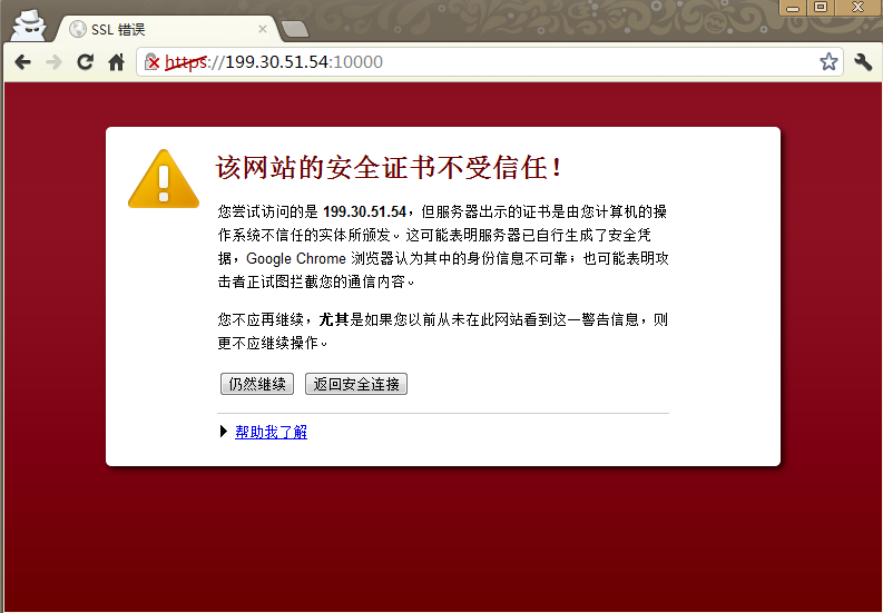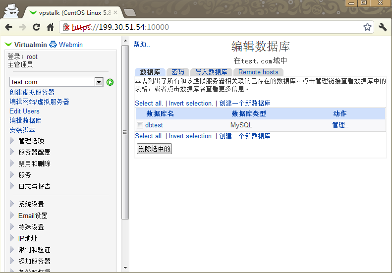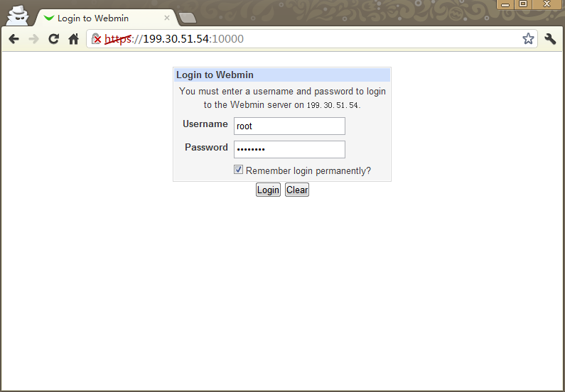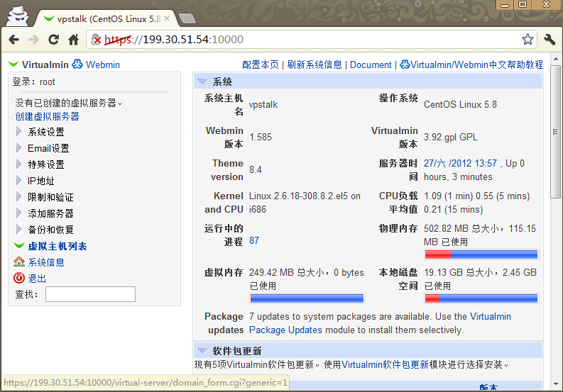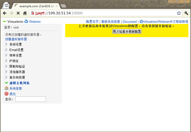 Virtualmin/Webmin 的默认登录地址为 https://VPSIP:10000/,登录后浏览器会提示 ssl 证书不受信任,这个无关紧要: