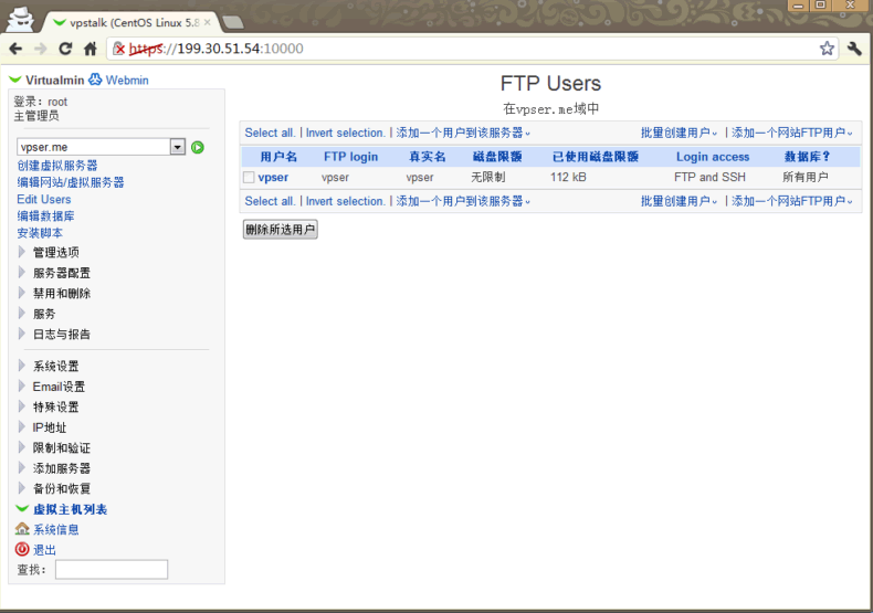 Virtualmin 添加后我们就能查看到一些可用的用户名,点击左边的“Edit users”链接,FTP 的用户名就会出现(应该是和你刚才在“描述”中输入的信息一样)。