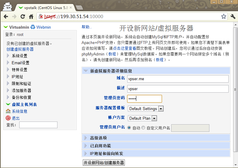首先点击左上角的“Virtualmin”链接进入 Virtualmin 后,点击“Virtualmin”链接下面的“创建虚拟服务器”链接, 开始添加网站: