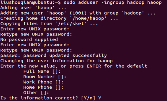 回车后会提示输入新的 UNIX 密码,这是新建用户 hadoop 的密码,输入回车即可。