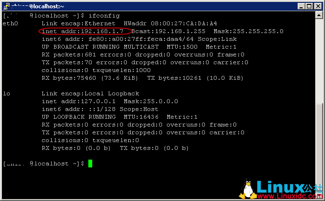 设置后在 CentOS 终端就可以查看到当前 IP 地址了,ifconfig: