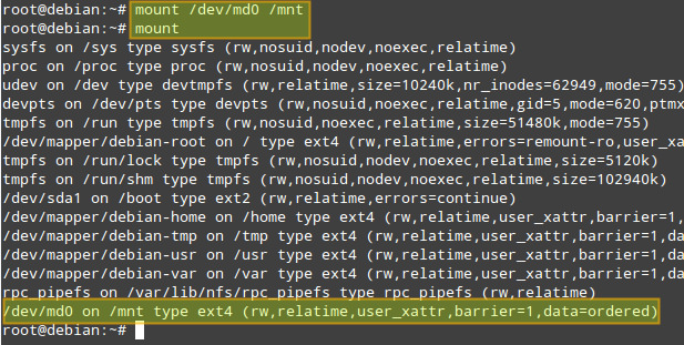 - # echo “/dev/md0 /mnt ext4 defaults 0 2” << /etc/fstab