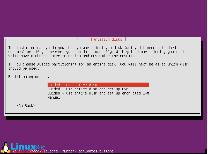 选择分区方案(译注:如果你有特定需求,可以采用 manual 分区方式,没有经验的用户可以使用预设的 Guied 分区模式。关于分区,是一个值得系统管理员仔细研究的课题,建议搜索更多深入的文章来看看,或者在此进行讨论):