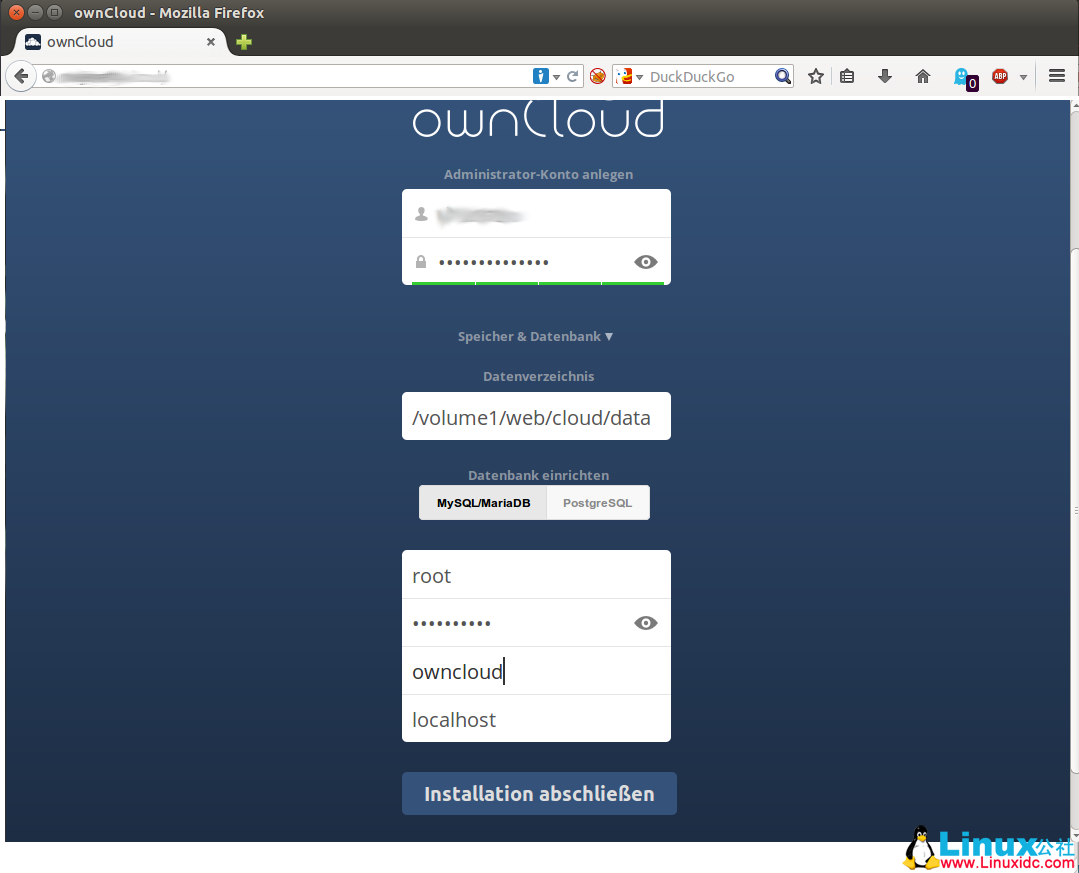 执行完毕,如果没有错误的话就安装完成了,可以通过 http:// 域名或 ip/owncloud 访问,将看到初始化配置界面。根据提示设置即可,注意,设置数据存储位置时,需要确保 www-data 用户具有写入该位置的权限(具体看配置)。