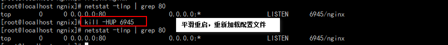 3)HUP 平滑重启,重新加载配置文件 SIGHUP 即 NGX_RECONFIGURE_SIGNAL