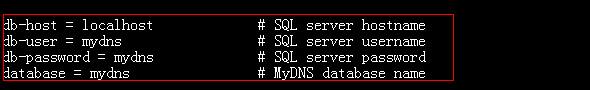 打开 mydns 的主配置文档指明数据库服务器和用户名登录密码