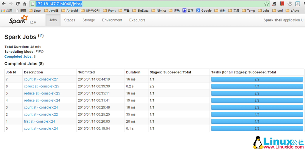 http://172.18.147.71:4040/jobs/,可以看到 spark 运行情况: