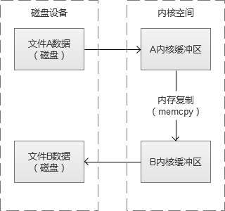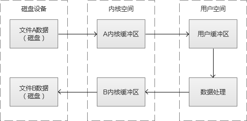 以最简单的磁盘读写例子,从磁盘中读取 A 文件,写入到 B 文件。A 文件数据是从磁盘开始,然后载入到“内核缓冲区”,然后再拷贝到“用户缓冲区”,我们才可以对数据进行处理。写入的时候,也同理,从“用户态缓冲区”载入到“内核缓冲区”,最后写入到磁盘 B 文件。