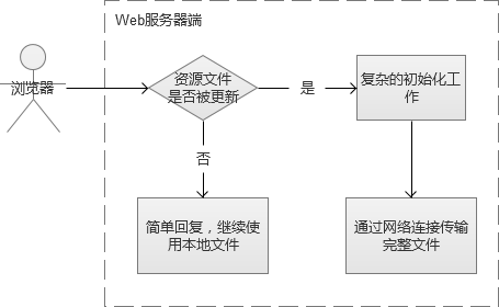 (2)服务器的文件或者内容已经更新,浏览器请求 Web 资源,Web 服务器通过网络传输新的资源内容。(发生通信,Web 服务器需要完成复杂的传输工作)