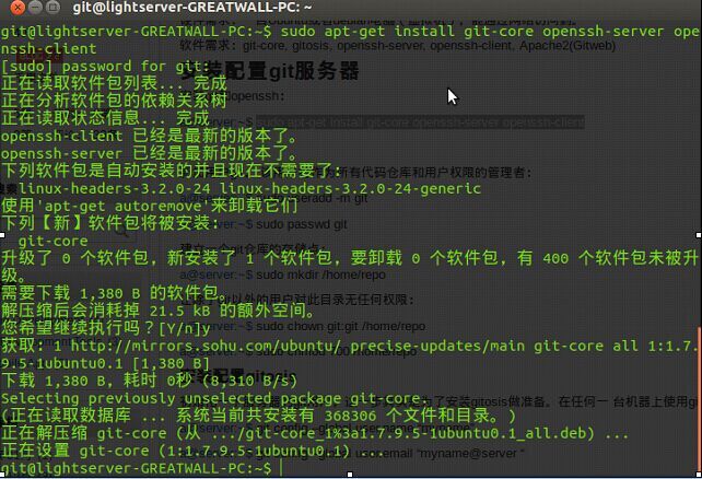 git@lightserver-GREATWALL-PC:~$ sudo apt-get install git-core openssh-server openssh-client