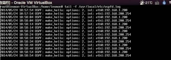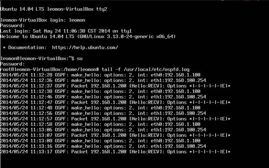 3. 查看一下日志输出,首先进入到 tty2 中,运行命令:tail -f /usr/local/etc/ospfd.log。截图如下。仔细观察日志输出,我们可以看到,路由器 B 已经接收到来自路由器 A(192.168.1.200)发送过来的 hello 数据包了。可见,我们已经成功了。
