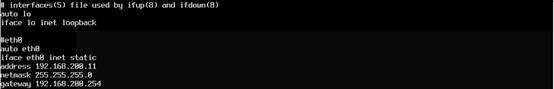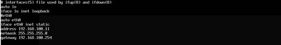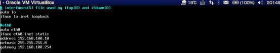 Step 1: 修改网卡 0 的 IP 地址,子网掩码等信息。终端输入命令:sudo vi /etc/network/interfaces,然后添加内容后如下: