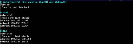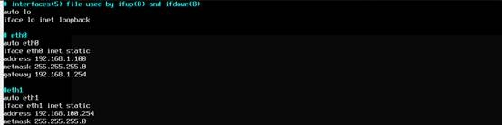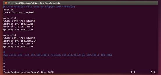 Step 1: 配置网卡 0 和网卡 1:sudo vi /etc/network/interfaces,然后在后面添加内容如下: