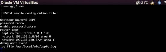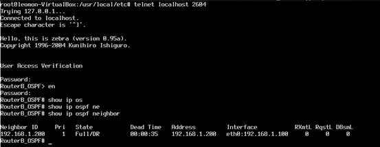 由于在配置路由器 B 时,操作的步骤基本同路由器 A 配置相同,只是在网段和 IP 地址等方面有稍许区别。所以不再赘述,详细设置步骤参见路由器 A 的设置。非常容易。还要注意,在开启 ospfd 之前,要保证 zebra 先运行。
