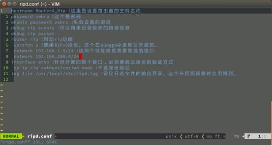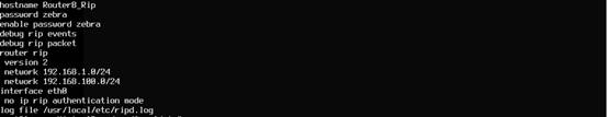 由于 zebra 本身是支持 RIP 协议的两个版本的,所以可以很轻松地搭建出一个路由器。后面的实验中将使用 RIPV2 这个协议。Quagga 貌似默认就是使用 RIPV2 协议,而 zebra 应当需要指定一���。