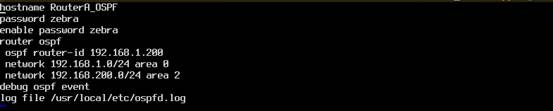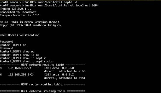最后,需要说明的是,由于 ospf 这个 daemon 在运行时需要从 zebra 程序中获得接口信息,故 zebra 程序必须先于 ospfd 运行。ospfd 不支持多个 OSPF 进程,不能指定 OSPF 进程号。下面开始实验。