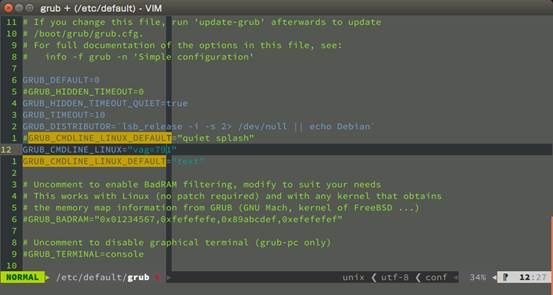 3、配置这几个系统。考虑到我们实际使用中需要开启四个虚拟机系统,所以肯定会很卡顿。所以,我的做法是,把 X -Window 给关闭,即让系统开机后直接进入 tty1。这样做的好处是,可以明显减少物理内存的占用,即使开启 4 个也没有卡顿的现象。当然,前提是要熟悉基本的 Linux 操作。设置方法如下:修改 /etc/default/grub 文件如下: