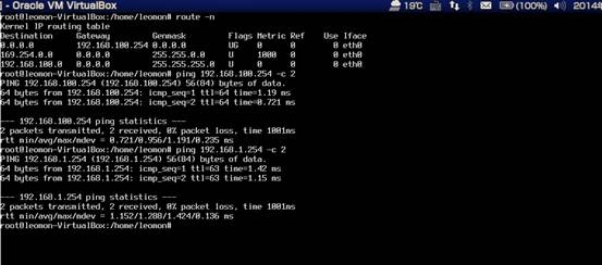 Step 3:查看一下路由表,route -n,并且尝试 ping 一下自己的网关和外部网关,如果成功,则表明客户端也基本配置完了。截图如下: