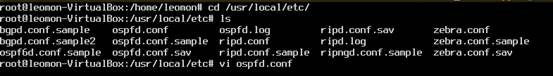 Step 3:配置路由器上的 zebra。在 Ubuntu 下面,zebra 的配置文件在目录:/usr/local/etc/ 下。在终端中切换到上面的目录中。