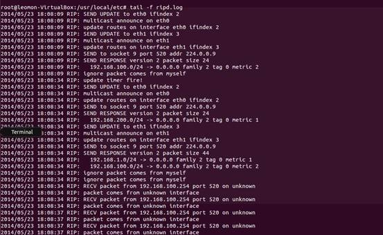 Step 8:保存上述配置,并启动 ripd 服务,输入 sudo ripd - d 即可。这样就完成了基本的 RIP 路由器的配置了。