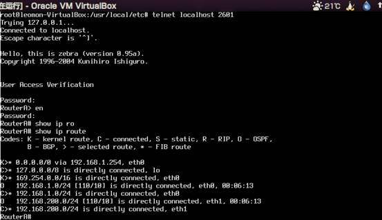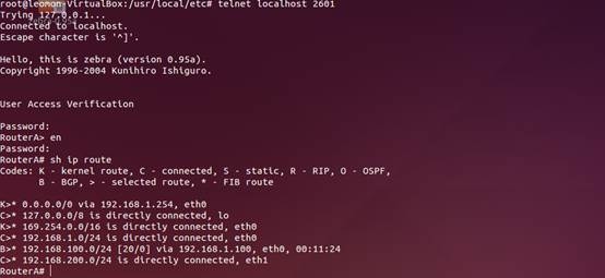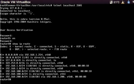 然后登陆到端口 2601 中进行查看, 如果出现了下面 R >* 的输出就表明配置成功了。同样也可以在路由器 B 中查看得到类似的结果。