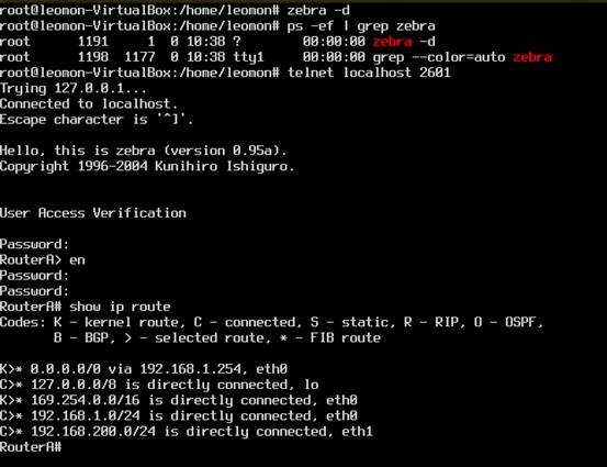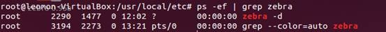 在开始实验之前,我们需要确定 zebra 已经在后台运行,可以使用命令:ps -ef | grep zebra 进行查看,在此需要注意的是,zebra.conf 的配置文件不要改动,我们继续使用上面的实验用的配置文件。