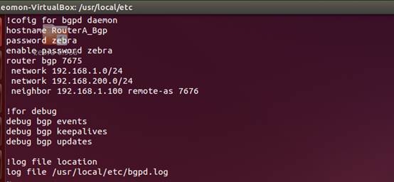Step 1:进入目录 /usr/local/etc 下面,创建配置文件:bgpd.conf,或者也可以复制那个 sample 配置文件。接下来,在 vi 编辑器中编辑配置文件,我配置的内容如下: