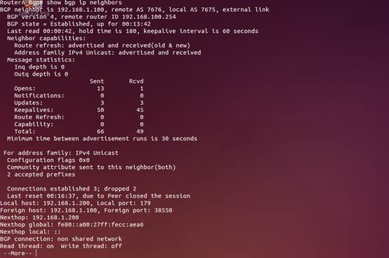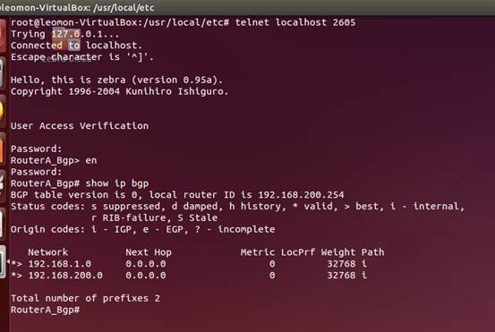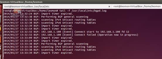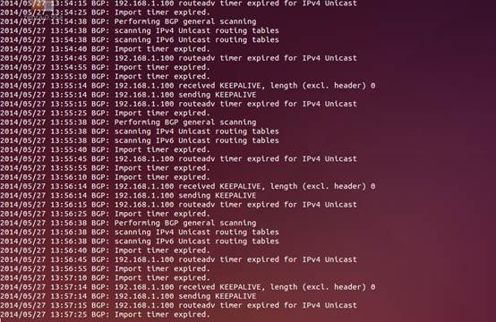 如果上面的步骤都是正确无误,且保证 zebra 和 bgpd 这两个 daemon 都在两个路由器上正常运行的话,就可以进行下面的一些测试了。