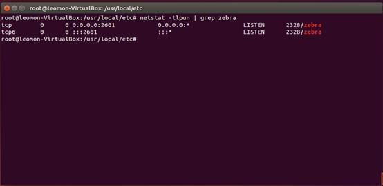 Step 5:运行命令:netstat -tnupl | grep zebra,可以看到 zebra 这个服务的主要任务就是要修改 Linux 系统内核内的路由,所以它仅仅就是监听本机接口罢了,并不会监听外部接口。
