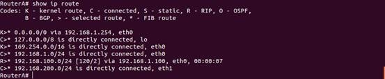 2. 查看路由表,同样,我们可以看到 O 192.168.1.0/24 之类的两行,它们是由 ospfd 服务产生的。