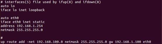 通常有两种方法来修改诸如 IP 地址,子网掩码之类的信息。一种方式是通过命令行的方式,即使用命令 ifconfig, ip route add 等命令(详细使用这些命令的方法可以通过 man 或者 help 命令来查看)来进行修改,但是通过命令行的方式来修改并不是一劳永逸的,它们会在系统重启后恢复原来的状态。所以,另外一种方法便是直接修改配置文件的方法了。关于配置文件,Ubuntu 主要是通过修改 /etc/network/interfaces 文件来实现。后面的实验会给出修改的方法。