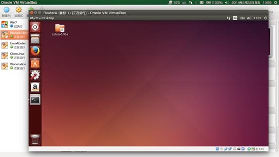 1、在虚拟机(我用的是 Virtual Box,若干次测试表明,在 Ubuntu 上使用这个虚拟机软件比较流畅)上安装上一个 Linux 系统,比如我用的 Ubuntu 14.04 桌面版。然后配置好系统,安装上 zebra/quagga 软件。