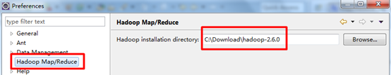 解压缩 hadoop-2.6.0.tar.gz 到 C:\Downloads\hadoop-2.6.0,在 eclipse 的 Windows->Preferences 的 Hadoop Map/Reduce 中设置安装目录。
