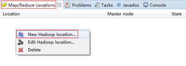 打开 Windows->Show View 中的 Map/Reduce Locations,如下图右键选择 New Hadoop location…新建 hadoop 连接。