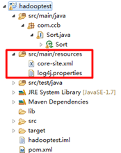 把 log4j.properties 和 hadoop 集群中的 core-site.xml 加入到 classpath 中。我的示例工程是 maven 组织,因此放到 src/main/resources 目录。