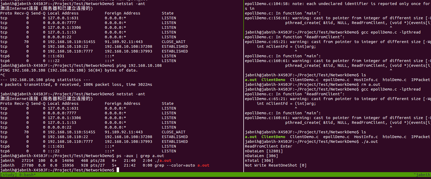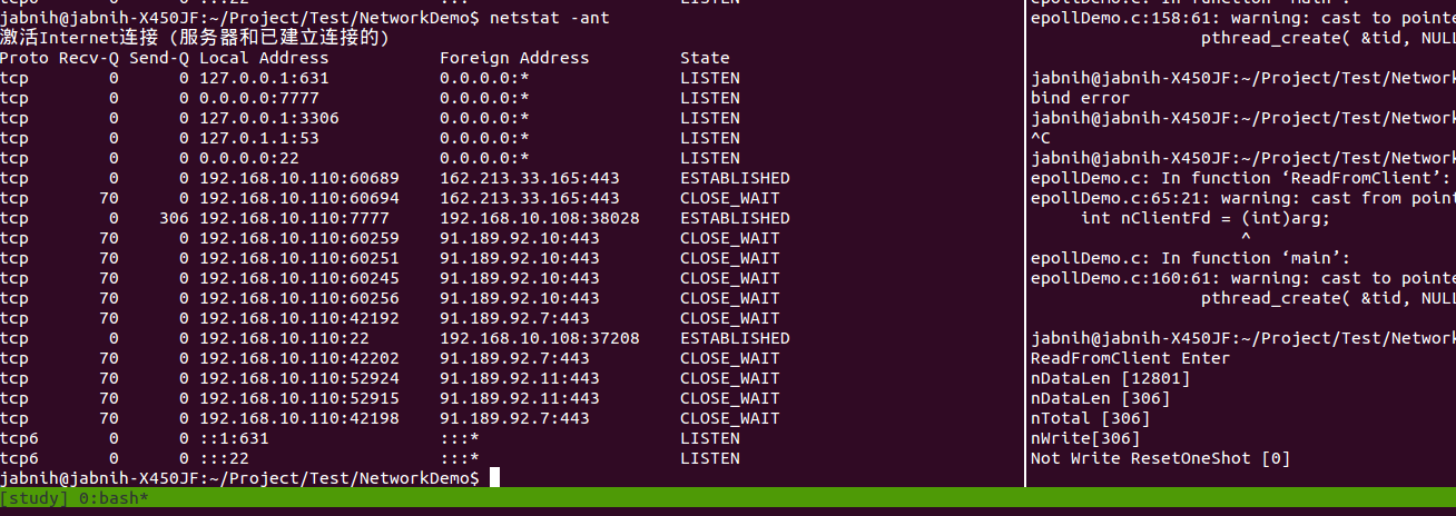 a. 客户端发送一个报文至服务端,然后断网 。(这里对程序做了点改动,这次实验注释了 write 响应,防止 write 影响测试,后面一个实验会使用 write)。