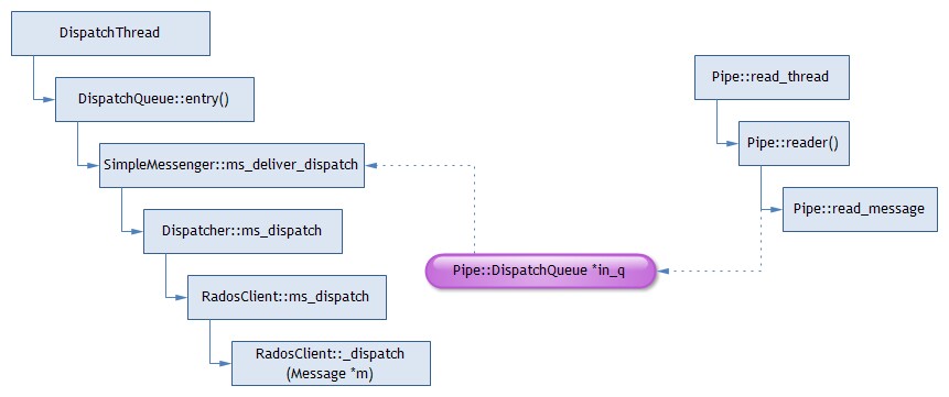 (3)包含一个分发队列 DispatchQueue,分发队列有一个专门的分发线程(DispatchThread),将消息分发给 Dispatcher(OSD)完成具体逻辑处理。