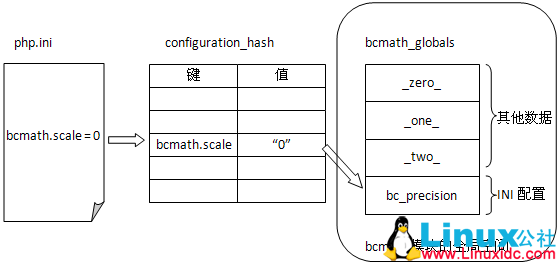 bcmath_globals 是一块真正的全局空间,它包含有四个字段。其最后一个字段 bc_precision,对应于 ini 配置中的 bcmath.scale。我们在 php.ini 中设置了bcmath.scale 的值,随后在启动 bcmath 模块的时候,bcmath.scale 的值 被更新到 bcmath_globals.bc_precision 中去。
