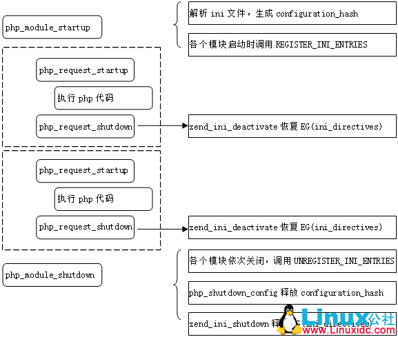 由于 php.ini 需要在 SAPI 过程中一直生效,那么解析 ini 文件并据此来构建 php 配置的工作,必定是发生 SAPI 的一开始。换句话说,也就是必定发生在 php 的启动过程中。php 需要任意一个实际的请求到达之前,其内部已经生成好这些配置。