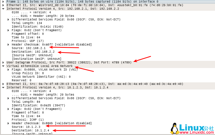 在 host1 的 docker 容器机里面 ping host2 的 docker 容器机,wireshark 抓包: