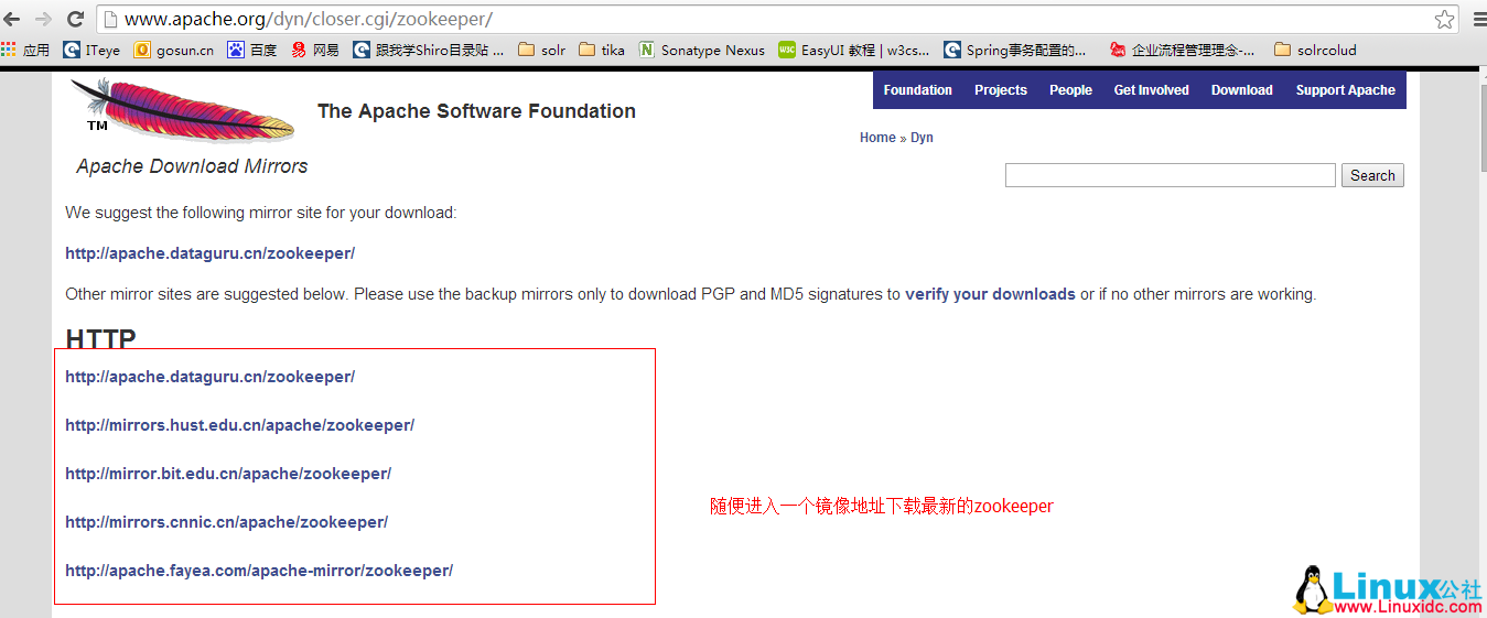 第一步:下载最新的 zooper 软件:http://www.apache.org/dyn/closer.cgi/zookeeper/