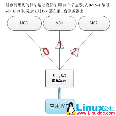 将 key 的值对服务器的台数取余,然后将对应的 value 值保存到对应的余数的那台 memcache 服务器上,一般这个 hash 函数 crc32(key) % 3