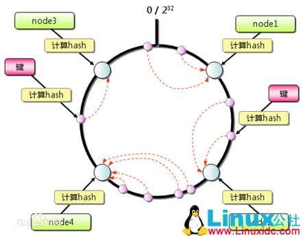 - 然后在将服务器的节点数通过 hash 函数(crc32())运算后,按照顺时针的方向映射到上面的圆环上