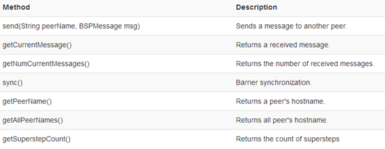 - BSPeer 在计算期间间的通信是 P2P 方式进行的,由 zookeeper 负责调度。在一个超步中 BSPeer 只能发消息或者处理上一个超步中接收到的消息。例:A 发送消息给 B—> 栅栏—> 本次超级步结束 下一个超级步开始—>B 接收到 A 发送的消息—>……