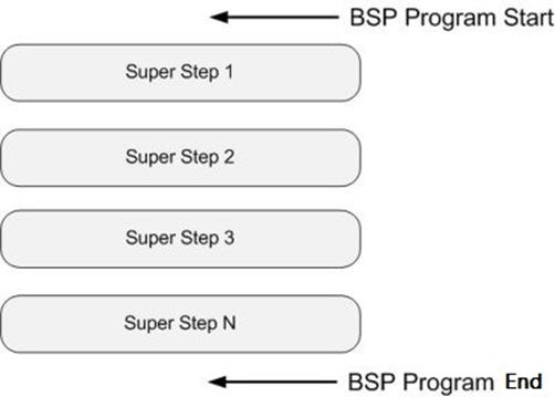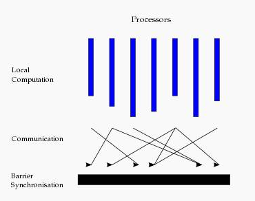 BSP 计算模型不仅是一种体系结构模型,也是设计并行程序的一种方法。BSP 程序设计准则是整体同步 (bulk synchrony),其独特之处在于超步(superstep) 概念的引入。一个 BSP 程序同时具有水平和垂直两个方面的结构。从垂直上看, 一个 BSP 程序由一系列串行的超步 (superstep) 组成, 如图所示:
