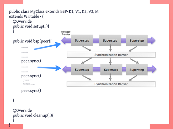 2. 按照我们自己的业务编写 bsp()方法,该方法内包含一个或多个超步,栅栏同步接口是peer.sync();