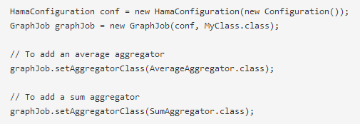 - 通过继承 org.apache.hama.graph.AbstractAggregator 类,可以编写自己的聚合器。聚合器用来做全局的通信、监控等。超步内所有的顶点都可以给聚合器一个值,聚合器整合所有点提供的值,在下一个超步每个顶点都可以使用聚合器整合后的值。在一个 job 里可以使用多个聚合器,只需要在创建 job 时注册一下即可,注册如下: