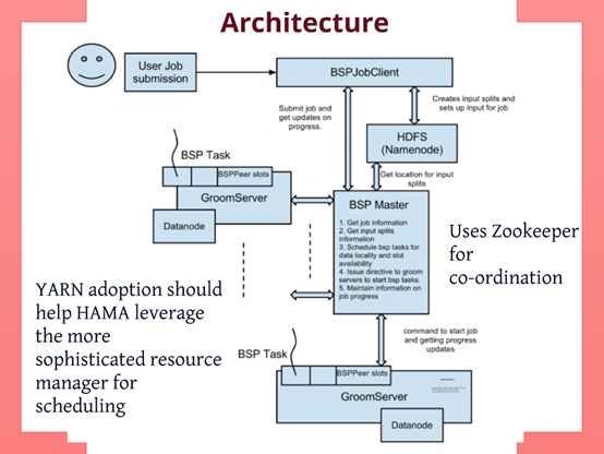 2008 年 5 月 Hama 被视为 Apache 众多项目中一个被孵化的项目,作为 Hadoop 项目中的一个子项目,BSP 模型是 Hama 计算的核心,并且实现了分布式的计算框架,采用这个框架可以用于矩阵计算 (matrix) 和面向图计算(graph)、网络计算(network)。
